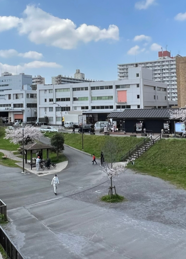 亀戸中央公園前の災害用船着場、亀戸中央公園乗船場のある広場です。亀の形の島とスカイツリーがフォトスポットに。