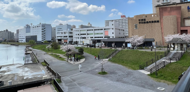 川の駅にぎわい施設を中心に水陸両用バスが利用するスロープや川床がある川沿いの広場エリア。北欧カフェの珈琲を飲みながらゆっくりとした時を過ごしたり、カヌーの練習風景を眺めながたり。BBQ場やイベント会場としても利用するにぎわいエリアです。