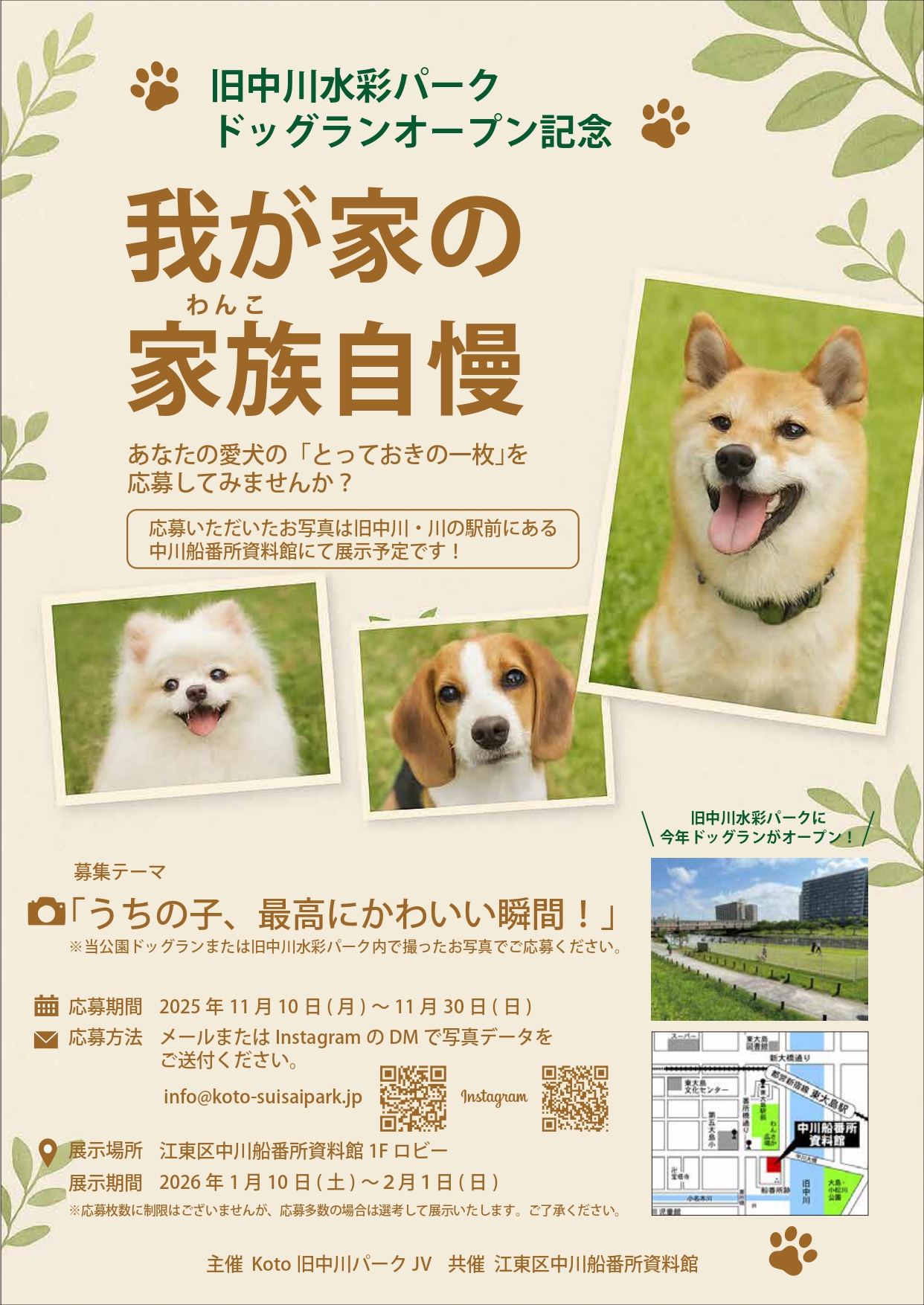 応募方法:当公園ドッグランまたは旧中川水辺公園内で撮ったお写真データをメールまたはInstagramのDMでご送付ください。