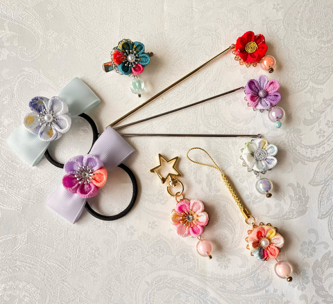 作ったお花はストラップ・クリップ付きブローチ・ミニかんざしに仕立てます。
