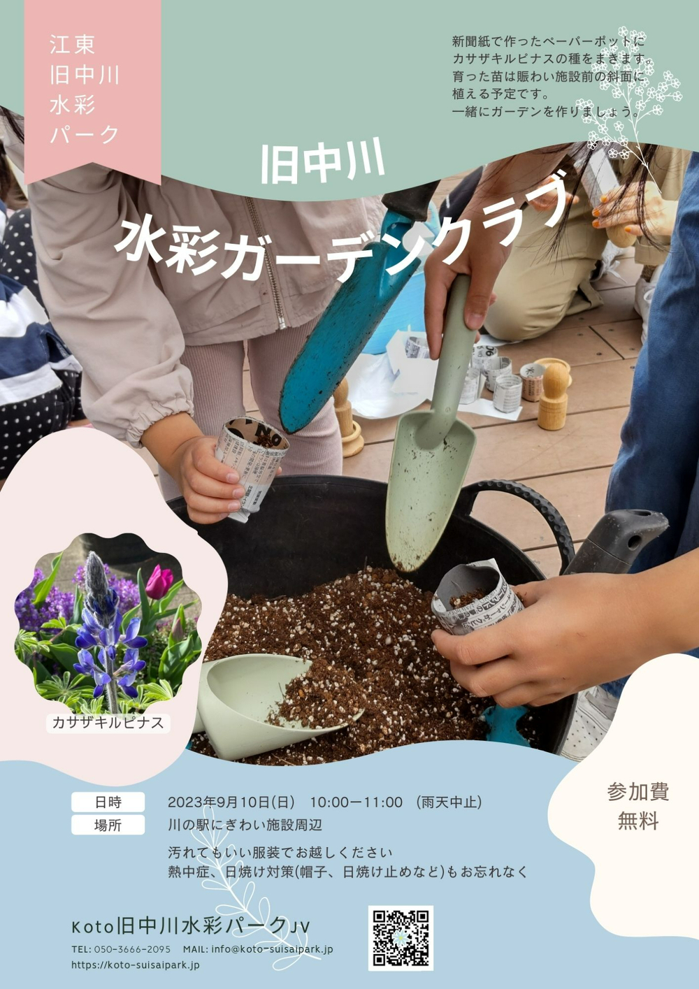 ブルーのルピナスの種をまこう! 募集中 イベントカレンダー 2023 9.10Sun-9.10Sun 10:00~11:00 開催場所 旧中川川の駅周辺 ペーパーポッターを使って新聞紙のポットを作り、ブルーのカサザキルピナスの種をまきます。 水彩ガーデンクラブ9月 料金 無料 主催 Koto旧中川水彩パークJV お問い合わせ先 050-3666-2095info@koto-sisaipark.jp 水彩ガーデンクラブ9月