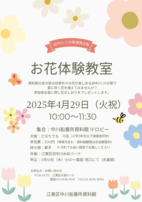 川の駅のすぐお隣にある『中川船番所資料館』と協働で、お花にふれるイベントを実施します!