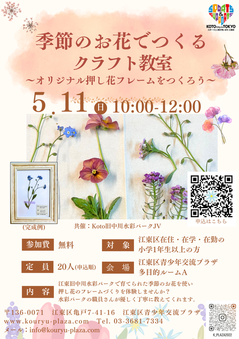季節のお花でつくるクラフト教室 ~オリジナル押し花フレーム~ イベントカレンダー 2025 5.11Sun 10:00~12:00 開催場所 江東区青少年交流プラザ 多目的ルームA 公園内で育てた季節の花を使い、押し花のフレームづくりを実施します。 素敵なフォトフレームを一緒に作りましょう! 〈場所〉江東区青少年交流プラザ 多目的ルームA 〈対象〉江東区在住・在学・在勤の小学1年生以上の方 〈参加費〉無料 〈定員〉20名程度(事前申込制、先着順) 〈時間〉10:00~12:00 〈日程〉5月11日(日) 料金 無料 主催 Koto旧中川水彩パークJV お問い合わせ先 江東旧中川水彩パークセンター TEL/050-3666-2095 E-mail/info@koto-suisaipark.jp
